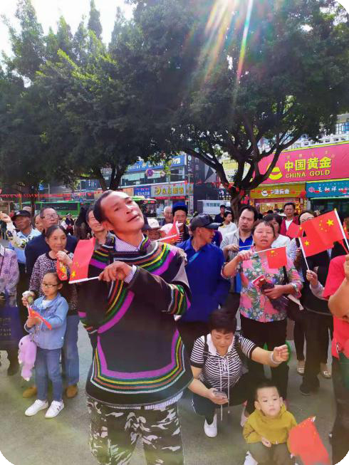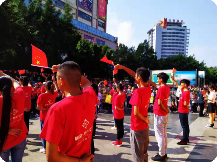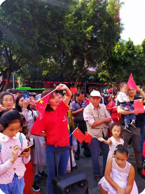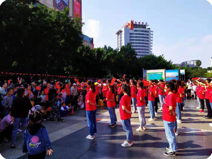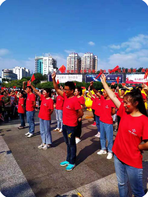 本次国庆活动为“歌唱祖国”快闪形式,集热点性、大众化、参与性、传播性、正能量为一体。10月1日,活动组织团队怀着激动之情,迎着朝霞拉开了国庆主题快闪活动的序幕。上午10时左右,与祖国首都北京天安门国庆活动同步时刻,西昌城区核心商业区“月城广场”出现了30名红衣歌唱者。他们面带笑容,精神抖擞,身着带有翡丽华府项目LOGO的红色体恤衫列队走入广场。随着音乐响起,“歌唱祖国”快闪活动激情上演。活动现场演唱了《歌唱祖国》、《我爱你中国》、《我和我的祖国》三首经典的讴歌祖国的歌曲。现场众多围观人群也挥舞着项目发放的红旗一同高唱...。人群手中的五星红旗迎风飘扬、充满激情的旋律,现场氛围异常热烈,使参与其中的每一个人都无比激动,同时也记住了一群来自树高的地产人!