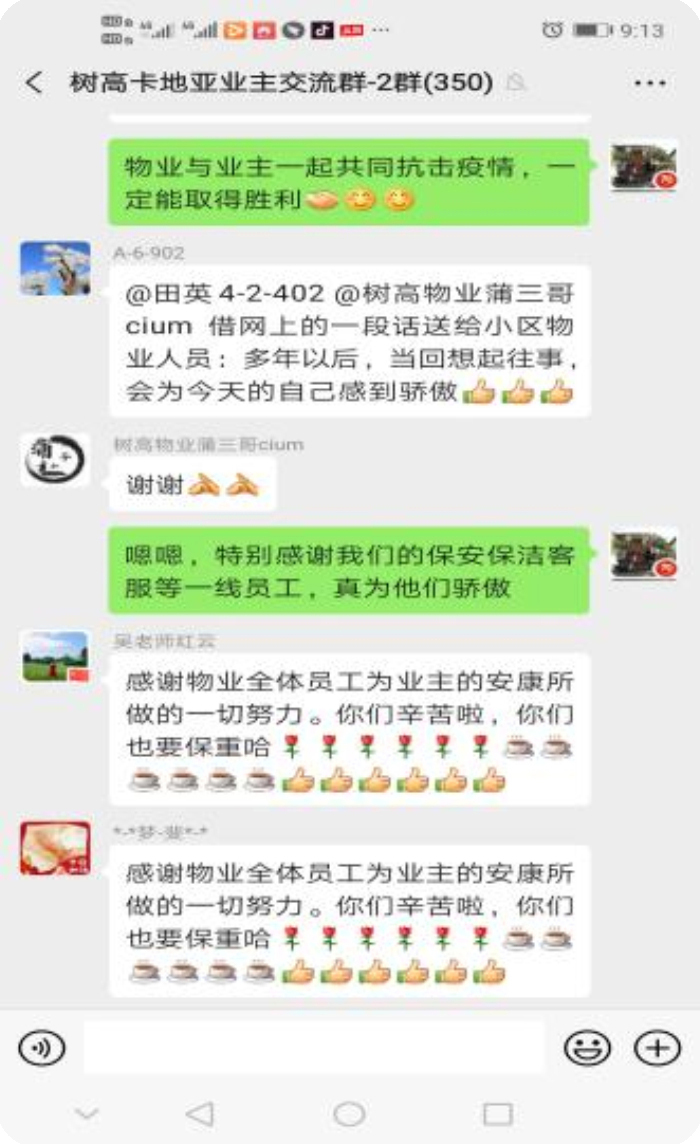 他们不是医生、护士,不是武警官兵,不是社区工作人员,他们只是普普通通的树高物业人。他们只有着一颗战胜疫情的热忱的心,只有一颗保护业主家园的心。当您玩厌了手机,看厌了电视剧,一刻都不想呆在家里时,您可知道,家是他们多么想回到的地方;当个别人打开微信、QQ,高高在上的在业主群里扮演着监督者指责他们时,他们却在最前线,全力保障广大业主的生命安全。他们只收了1.6、2元物业费,却靠一个口罩、一双手套、一把体温枪,拿生命为业主们守护家园;他们只收了1.6、2元物业费,却购买了足够的消毒水、酒精对抗无处不潜伏的骇人病菌。他们也会生气,但他们把委屈放在心里,把眼泪流在人后,依然用微笑和柔情劝阻、提醒,没有一丝退缩。他们不要勋功章,他们只希望得到您们的理解、支持。只希望在您出门时出示下您的出入证,只希望在您回家时,配合测量体温,配合登记。只希望您按时交纳物业费,只希望物业与业主一起同心同德、众志成城,战胜病毒。只希望待春暖花开,小区重归宁静与安好。
