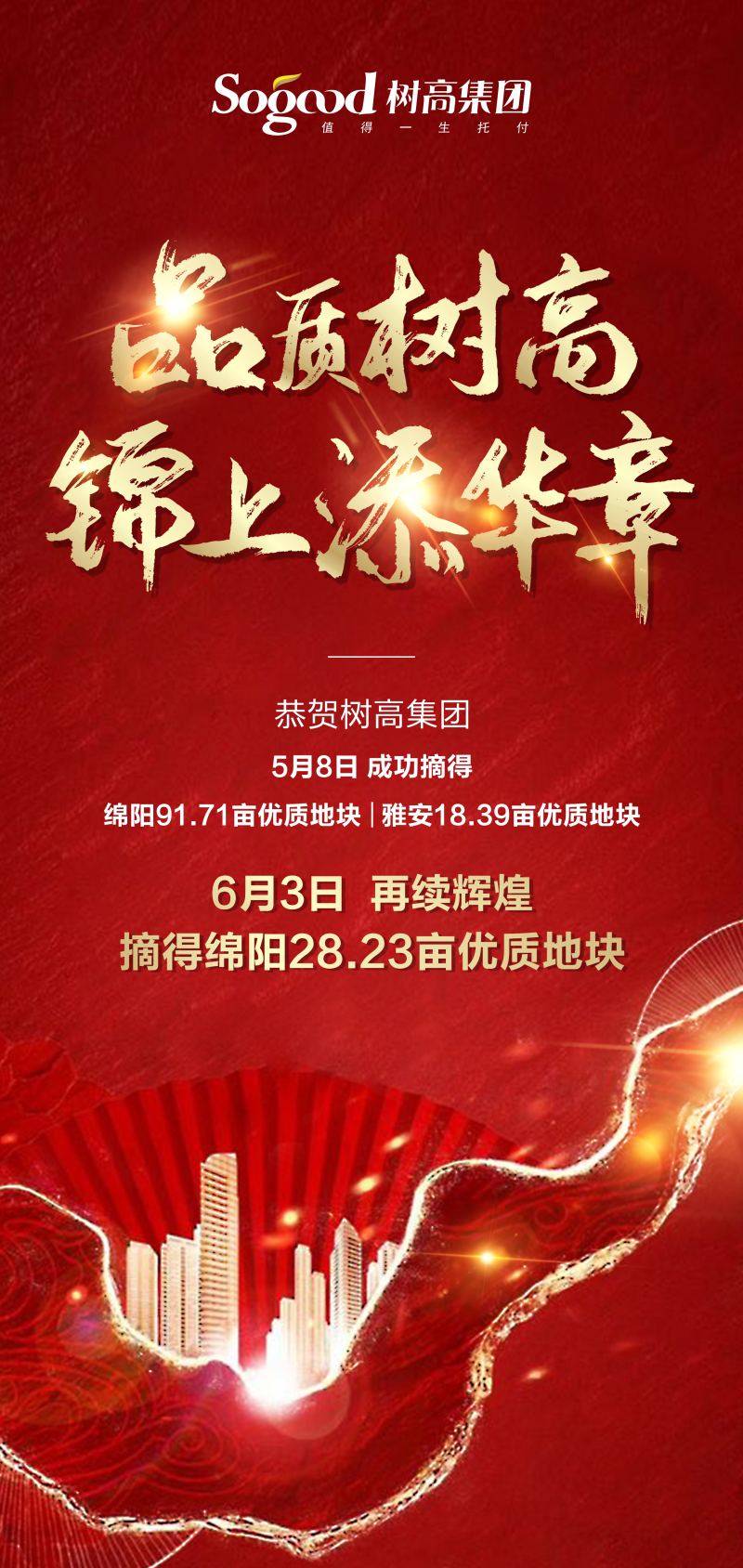 继5月8日树高集团在绵阳、雅安连获91.71亩、18.39亩优质地块后,2020年6月3日,树高集团又势如破竹成功拿地,摘得绵阳28.23亩优质地块,为新增土地再添华章!