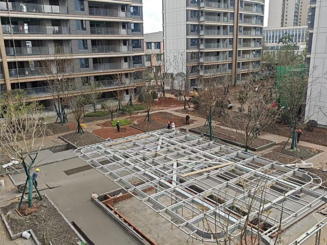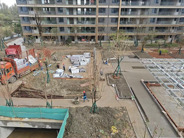 10、总平园林管网安装完成100%;园区平场完成100%;道路硬化完成100%;花池砌筑完成80%;基础开挖完成100%;树植种植完成80%;亭子基础龙骨施工完成100%;围墙做砖抹灰完成100%;水池防水保护层施工完成;